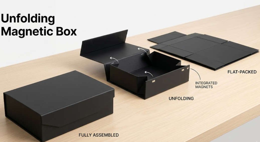 Une boîte magnétique dépliable (également appelée boîte rigide magnétique pliable) est un emballage pliable qui peut être expédié à plat et assemblé pour former une boîte rigide haut de gamme. Son système d'ouverture, semblable à celui d'un livre, est généralement maintenu par des aimants néodyme intégrés, garantissant une fermeture sûre et sans défaut.